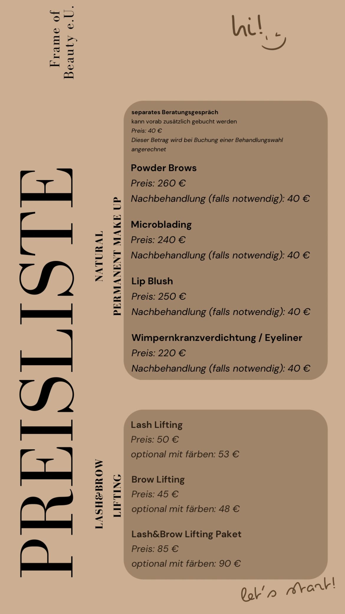 Bei Frame of Beauty in Leibnitz erhältst du hochwertige Behandlungen zu fairen Preisen. Jede Behandlung wird individuell auf dich abgestimmt – für Ergebnisse, die natürlich, präzise und langlebig sind. Transparenz und Qualität stehen dabei an erster Stelle.
